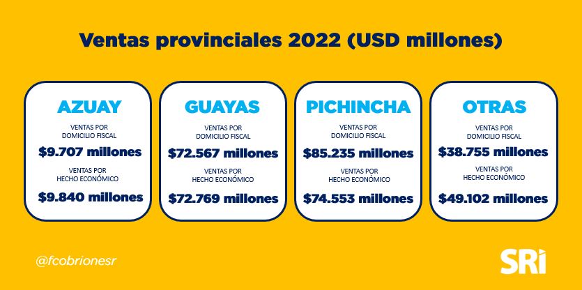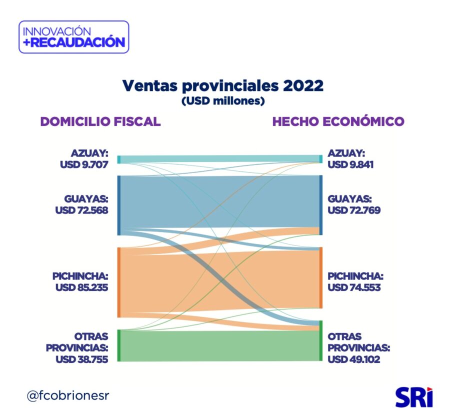 Usualmente, la estadística oficial por provincia se hace con base en el domicilio fiscal pero no captura lo que realmente se produce y paga en ellas. Un ejemplo es la cadena comercial con sucursales a nivel nacional. Vende en todo el país, pero declara en una sola provincia. Una forma habitual de presentar la recaudación es por provincia. Sin embargo, es importante notar que, en este caso, la serie estadística publicada habitualmente por el SRI se refiere al lugar geográfico en el cual se encuentra domiciliado fiscalmente el contribuyente, mas no en el que sucede el hecho económico generador del impuesto. En otras palabras, donde se registró la matriz del contribuyente en su RUC (Registro único del contribuyente) y no donde se realizan, por ejemplo, las ventas.