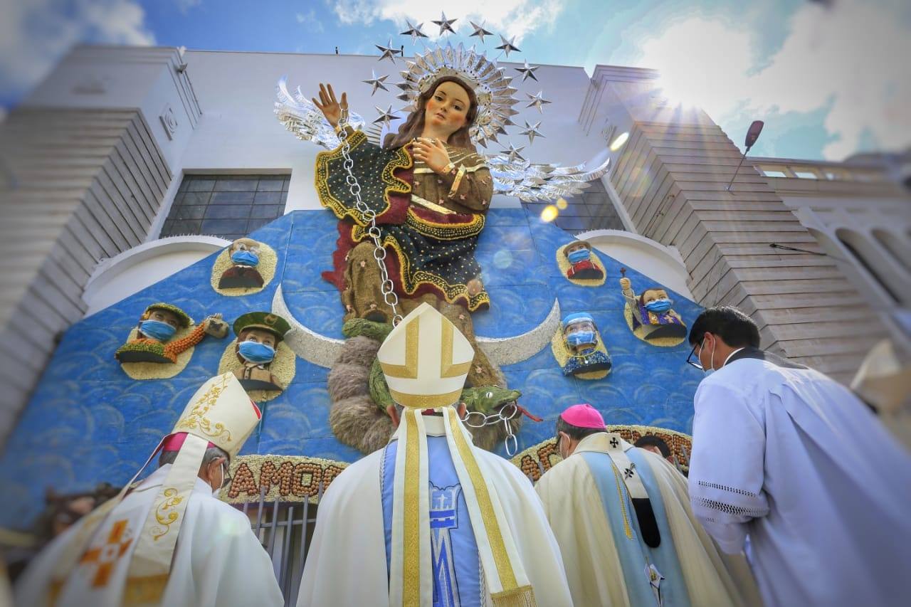 Hasta el martes 16 de febrero estuvo expuesta la alegoría que este año tuvo la singular representación de la virgen María y a su lado imágenes de personas que trabajaron en primera línea como la Policía Nacional, militares, médicos, enfermeras y más.