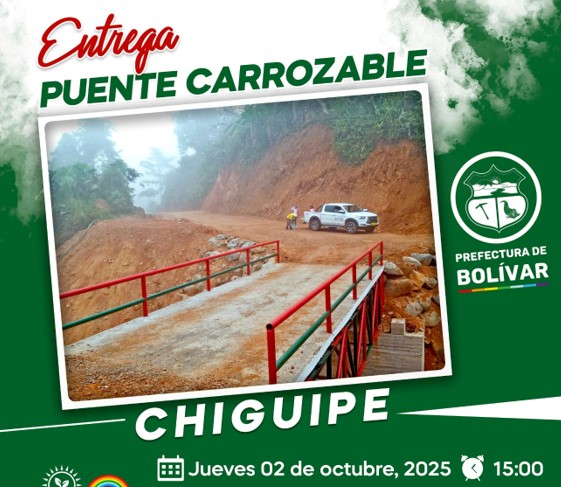 La Prefectura de Bolívar, bajo la administración del prefecto Aníbal Coronel Monar, inaugurará este jueves 2 de octubre de 2025 un nuevo puente carrozable en el recinto Chiguipe, parroquia San Luis de Pambil, cantón Guaranda. La ceremonia oficial está prevista a las 15h00 en el mismo sector.